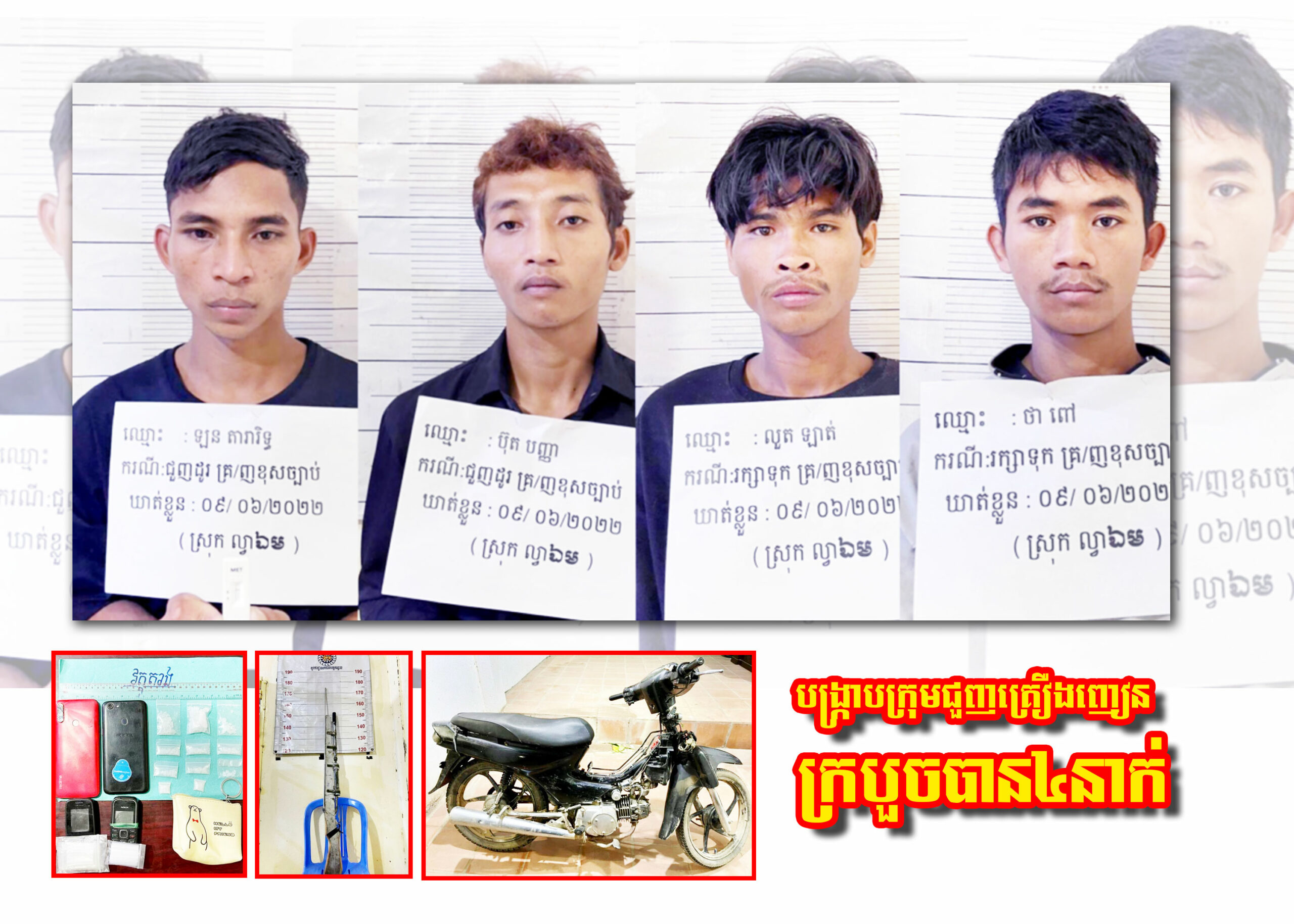 ខេត្តកណ្តាល ៈ ជនសង្ស័យ ៤នាក់ ក្នុងចំណោម៥នាក់ ដែលពាក់ព័ន្ធទៅនឹងករណីជួញដូររក្សាទុកនិងប្រើប្រាស់ថ្នាំញៀន ត្រូវបានកម្លាំងសមត្ថកិច្ចចម្រុះ ឃាត់ខ្លួនបានជាបន្តបន្ទាប់ នៅចំណុចទីតាំង ២ផ្សេងគ្នា ទី១-កាលពីវេលាម៉ោង ១១និង៣០នាទីព្រឹក ថ្ងៃទី០៩ ខែមិថុនា ឆ្នាំ២០២២ នៅចំណុចផ្លូវកៅស៊ូ ភូមិត្បូងដំរី ឃុំកំពង់ចម្លង ស្រុកខ្សាច់កណ្តាល និងទី២-កាលពីវេលាម៉ោង ៤និង៣០នាទីរសៀល ថ្ងៃដដែល នៅចំណុចភូមិបារាជ ឃុំស្វាយជ្រំ ស្រុកខ្សាច់កណ្តាល។