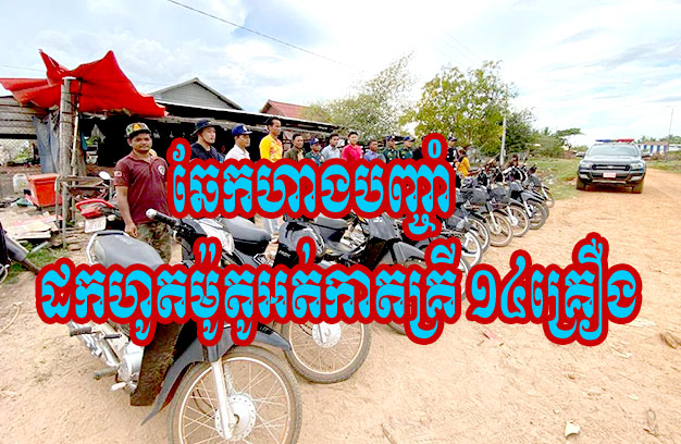 ម៉ូតូទាំង ១៤គ្រឿង ដែលត្រូវបានដកហូត រួមមាន ៖ ១-ម៉ូតូម៉ាកហុងដា ឌ្រីម សេ១២៥ ស៊េរីឆ្នាំ២០២១ គ្មានស្លាកលេខ។ ២-ម៉ូតូម៉ាកហុងដា ឌ្រីម សេ១២៥ ស៊េរីឆ្នាំ២០១០ ស្លាកលេខ សៀមរាប 1AI-2899។ ៣-ម៉ូតូម៉ាកហុងដា ឌ្រីម សេ១២៥ គ្មានស្លាកលេខ។ ៤-ម៉ូតូម៉ាកហុងដាឌ្រីម សេ១២៥ ស៊េរីឆ្នាំ២០២២ គ្មានស្លាកលេខ។ ៥-ម៉ូតូម៉ាកហុងដា ឌ្រីម សេ១២៥ ស៊េរីឆ្នាំ២០២១ គ្មានស្លាកលេខ។ ៦-ម៉ូតូម៉ាកហុងដា ឌ្រីម សេ១២៥ ស៊េរីឆ្នាំ២០១៨ គ្មានស្លាកលេខ។ ៧-ម៉ូតូម៉ាកហុងដា ឌ្រីម សេ១២៥ ស៊េរីឆ្នាំ២០២១ គ្មានស្លាកលេខ។ ៨-ម៉ូតូម៉ាកហុងដា ឌ្រីម សេ១២៥ ស៊េរីឆ្នាំ២០១៦ ពាក់ស្លាកលេខ កំពង់ស្ពឺ 1H-2432។ ៩-ម៉ូតូម៉ាកហុងដា ឌ្រីម សេ១២៥ ស៊េរីឆ្នាំ២០២១ ពាក់ស្លាកលេខ សៀមរាប 1AL-1491។ ១០-ម៉ូតូម៉ាកហុងដា វ៉េវ ស៊េរីឆ្នាំ២០១៩ គ្មានស្លាកលេខ។ ១១-ម៉ូតូម៉ាកហុងដា ឌ្រីម សេ១២៥ ស៊េរីឆ្នាំ២០១៦ ពាក់ស្លាកលេខ សៀមរាប 1X-1599។ ១២-ម៉ូតូម៉ាកហុងដា ឌ្រីម សេ១២៥ ស៊េរីឆ្នាំ២០២១ ពាក់ស្លាកលេខ សៀមរាប 1AL-8548។ ១៣-ម៉ូតូម៉ាកហុងដា ឌ្រីម សេ១២៥ ស៊េរីឆ្នាំ២០០៩ ពាក់ស្លាកលេខ 1AD-6550 និង១៤-ម៉ូតូម៉ាកហុងដា Moov ពាក់ស្លាកលេខ សៀមរាប 1X-6494។