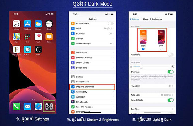 បន្ទាប់ពីលោកអ្នកធ្វើបច្ចុប្បន្នភាព លោកអ្នកអាចជ្រើសយករវាង Light Mode ឬ Dark Mode។ Dark Mode គឺជាមុខងារថ្មីមួយដែលធ្វើឱ្យផ្ទៃអេក្រង់មានភាពខ្មៅជាងមុន ដែលនេះអាចផ្ដល់សារប្រយោជន៍យ៉ាងខ្លាំង សម្រាប់អ្នកប្រើប្រាស់ដែលមានបញ្ហាភ្នែកជាមួយពន្លឺ។ ប្រសិនបើលោកអ្នកចង់ធ្វើការបើកឬបិទមុខងារនេះនៅពេលក្រោយ លោកអ្នកអាចចូលទៅ Settings > Display & Brightness ហើយជ្រើសយក Light ឬ Dark។