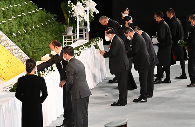 តូក្យូ (ជប៉ុន) ៖ នៅរសៀលថ្ងៃទី២៧ ខែកញ្ញា ឆ្នាំ២០២២ សម្តេចហ៊ុន សែន នាយករដ្ឋមន្ត្រីនៃព្រះរាជាណាចក្រកម្ពុជា បានអញ្ជើញចូលរួមពិធីបុណ្យសពថ្នាក់ជាតិ ជូនលោកស៊ីនហ្សូ អាបេ អតីតនាយករដ្ឋមន្ត្រីជប៉ុន ដែលបានរៀបចំឡើងនៅសាល Nippon Budokan តាមបែបបទប្រពៃណី និងសាសនាជប៉ុន និងត្រូវបានផ្តល់មហាកិត្តិយសជូនអំណោយពីប្រេសិតរបស់ព្រះចៅអធិរាជ និងព្រះរាជអគ្គមហេសី និងអតីតព្រះចៅអធិរាជ និងព្រះរាជអគ្គមហេសី រួមនិងការថ្វាយកម្រងផ្កា ពីសមាជិកព្រះរាជវង្សានុវង្សជប៉ុន និងមានការចូលរួមពីថ្នាក់ដឹកនាំ ជាប្រមុខរដ្ឋ-រដ្ឋាភិបាល អតីតមេដឹកនាំពិភពលោក ប្រមាណ ៥០រូប និងភ្ញៀវកិត្តិយសអន្តរជាតិ ប្រមាណ ៧០០នាក់ និងភ្ញៀវជាតិ សរុបទាំងអស់ប្រមាណ ៤៥០០នាក់ បានអញ្ជើញមកចូលរួមគោរពវិញ្ញាណក្ខន្ធ និងពិធីបុណ្យសពថ្នាក់ជាតិ ដើម្បីលាគ្នាជាលើកចុងក្រោយ។