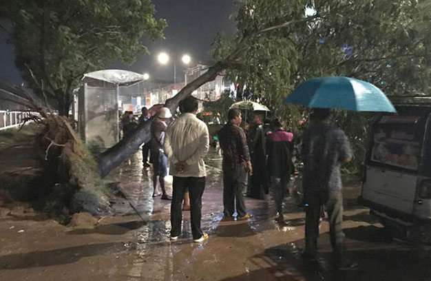 ភ្នំពេញ ៖ ភ្លៀងមួយមេធំ លាយឡំទៅដោយខ្យល់កន្ត្រាក់ បានបោកបក់ស្ទើរទូទាំងរាជធានីភ្នំពេញ និងបណ្តាលឱ្យដើមអង្កាញ់ ១ដើមធំ បាក់រលំសង្កត់ម៉ូតូកង់បី ១គ្រឿង បណ្តាលឱ្យរងការខូចខាតយ៉ាងធ្ងន់ធ្ងរ សំណាងល្អមិនប៉ះពាល់ដល់អាយុជីវិតមនុស្សណាម្នាក់ឡើយ។