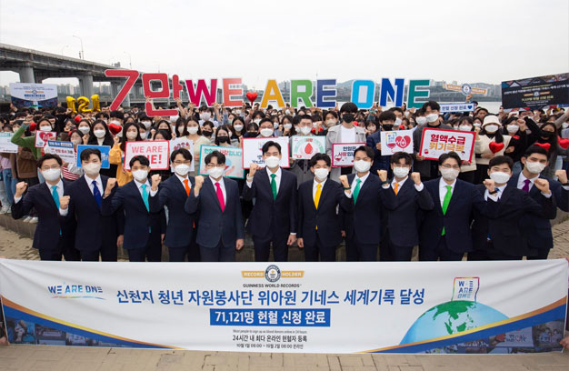 អ្នកស្ម័គ្រចិត្តកូរ៉េខាងត្បូងត្រូវបានចុះបញ្ជីក្នុងកំណត់ត្រាពិភពលោក GUINNESS WORLD RECORDS™ ថាជាអ្នក បរិច្ចាគឈាមដែលបានចុះឈ្មោះច្រើនបំផុតក្នុងរយៈពេល 24ម៉ោង។ នៅថ្ងៃទី1 ខែតុលា ក្រុមយុវជនស្ម័គ្រចិត្ត ‘We Are One’ បានបញ្ចប់ការស្នើសុំបរិច្ចាគឈាមតាមអ៊ីនធឺណិតសម្រាប់អ្នកស្ម័គ្រចិត្តចំនួន 71,121នាក់ សម្រាប់ រយៈពេល 24ម៉ោង ដើម្បីប្រជែងយកកំណត់ត្រាពិភពលោក GUINNESS WORLD RECORDS™ ។