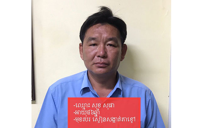 មន្ត្រីនគរបាលនៃស្នងការដ្ឋាននគរបាលខេត្តកណ្តាល បានឱ្យដឹងថា ជនសង្ស័យដែលត្រូវបានឃាត់ខ្លួន មានឈ្មោះសុខ សុផា ភេទប្រុស អាយុ៤៦ឆ្នាំ មុខរបរស្មៀនសាលាសង្កាត់តាខ្មៅ មានលំនៅក្នុងភូមិព្រែកសំរោង២ សង្កាត់តាខ្មៅ ក្រុងតាខ្មៅ។