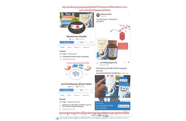 ភ្នំពេញ ៖ ក្រសួងសុខាភិបាល នៃព្រះរាជាណាចក្រកម្ពុជា សូមជម្រាបជូនដល់សាធារណជន ទាំងអស់ឱ្យបានជ្រាបថា យោងតាមការពិនិត្យឃើញលើបណ្តាញសង្គម ហ្វេសប៊ុក មានគណនីចំនួន២ ឈ្មោះ Medicine Health និងសុខភាពជាទ្រព្យ-ថ្នាំក្រពះជប៉ុន កំពុងផ្សព្វផ្សាយ លក់ឱសថ ឈ្មោះ NAIKA គ្មានលេខបញ្ជិកាពីក្រសួងសុខាភិបាល គិតត្រឹមថ្ងៃទី១១ ខែតុលា ឆ្នាំ២០២២។