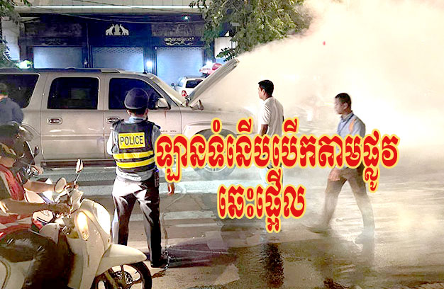 ភ្នំពេញ ៖ បុរសម្នាក់ កំពុងបើកបររថយន្តស៊េរីទំនើបរបស់ខ្លួននៅតាមផ្លូវសុខៗ ស្រាប់តែមិនដឹងថាមានបញ្ហាអ្វី ក៏ស្រាប់តែឃើញមាន ផ្សែងហុយទ្រលោម ចេញពីកាប៊ីនរថយន្តផ្នែកខាងមុខ (គម្របម៉ាស៊ីន) បង្កឱ្យមានការភ្ញាក់ផ្អើលដល់ប្រជាពលរដ្ឋ និងម្ចាស់រថយន្ត យកបំពង់ ពន្លត់អគ្គិភ័យមកបាញ់ទាន់ពេលវេលា។