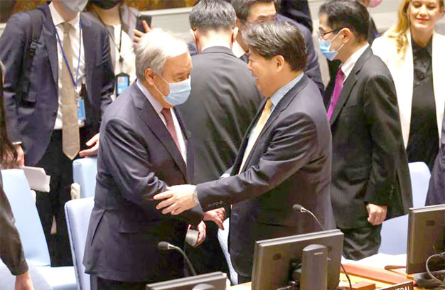 ក្នុងកិច្ចប្រជុំក្រុមប្រឹក្សាសន្តិសុខស្តីពីនីតិរដ្ឋដឹកនាំដោយរដ្ឋមន្ត្រីការបរទេសជប៉ុន Yoshimasa Hayashi ប្រមុខ UN បានគូសបញ្ជាក់ថា កម្មវិធីអាវុធនុយក្លេអ៊ែរខុសច្បាប់ដែលកំពុងដំណើរការដោយប្រទេសកូរ៉េខាងជើង គឺជាក់ លាក់និងពិតជាគ្រោះថ្នាក់ណាស់សម្រាប់បច្ចុប្បន្ន ដែលនាំឲ្យហានិភ័យនិងភាពតានតឹងភូមិសាស្ត្រនយោបាយ ។