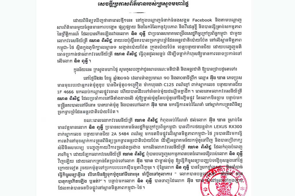 ភ្នំពេញៈ ក្រសួងមហាផ្ទៃ កាលពីថ្ងៃទី២៩ ខែធ្នូ ឆ្នាំ២០១៦ បានចេញសេចក្ដីប្រកាស ព័ត៌មាន លើកឡើងអំពីវិធានការចាប់ខ្លួនមន្រ្តីគណបក្សប្រឆាំង ដោយបានបញ្ជាក់ថា វរសេនីយ៍ត្រី លោក ឈាន ពិសិដ្ឋ ពិតជាបានរងគ្រោះដោយសាររថយន្ដរបស់លោក ឌិន ពុទ្ធី បុកពិតប្រាកដមែន។ ដូច្នេះក្រសួងអំពាវនាវឲ្យសាធារណជន រក្សាភាពស្ងៀម ស្ងាត់ ត្រូវរង់ចាំលទ្ធផលចំណាត់ការរបស់តុលាការ ជាមុនសិន។