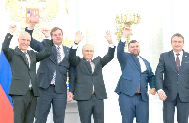 ប្រទេសរុស្ស៊ីបានប្រកាសដាក់បញ្ចូលតំបន់ Donetsk, Luhansk, Kherson និង Zaporizhzhia ដែលមានផ្ទៃដី​ស្មើ​នឹង១៥%នៃផ្ទៃដីទាំងមូលរបស់អ៊ុយក្រែនកាលពីខែកញ្ញាឆ្នាំមុន។ លោក Peskov បាននិយាយថា រុស្ស៊ីបើក​ចំហ​ចំពោះការចរចា ប្រសិនបើទីក្រុងគៀវប្រគល់តំបន់នោះ គ្មានតំបន់ណាមួយត្រូវបានគ្រប់គ្រងទាំងស្រុងដោយ​កងកម្លាំងរបស់ទីក្រុងម៉ូស្គូនោះទេ។