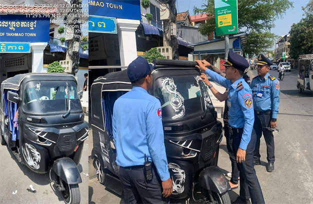 តាមប្រភពសមត្ថកិច្ចក្រុងតាខ្មៅ បានឲ្យដឹងថា បន្ទាប់ពីមានការផ្សព្វផ្សាយលើបណ្តាញសង្គម ទាក់ទងទៅ នឹង ក្រុមម៉ូតូកង់បី បំពាក់អំពូលភ្លើង និងស៊ីផ្លេ ខុសបច្ចេកទេស ហើយបើកបរយ៉ាងអនាធិបតេយ្យនៅលើដងផ្លូវ ដោយអនុវត្តតាមបទបញ្ជារបស់លោកឧត្តមសេនីយ៍ទោ ឈឿន សុចិត្ត ស្នងការនៃស្នងការដ្ឋាននគរបាល ខេត្តកណ្តាល នៅព្រឹកថ្ងៃទី១៦ ខែមីនា ឆ្នាំ២០២៣ កម្លាំងនៃអធិការដ្ឋានក្រុងតាខ្មៅ បានចុះឃាត់ម៉ូតូកង់បី កែ ច្នៃខុសលក្ខណៈបច្ចេកទេស មួយគ្រឿង ម៉ាក BAJAJពណ៌លឿង ពាក់ផ្លាកលេខ ព្រះសីហនុ 1H-6593 បើក បរដោយឈ្មោះស៊ា គឹមសេង ភេទប្រុសអាយុ២៧ឆ្នាំ មានលំនៅ ភូមិព្រៃខ្លា ឃុំក្រោលគោ ស្រុកស្វាយរៀង ខេត្ត ស្វាយរៀង ក្នុងគោលបំណងដឹកកម្មករទៅធ្វើការនៅសង្កាត់រការខ្ពស់ ក្រុងតាខ្មៅ ខេត្តកណ្តាល ។