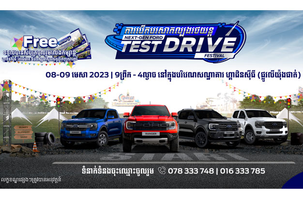 កុំភ្លេចជួបគ្នានៅថ្ងៃទី 08-09 មេសា 2023 ម៉ោង 9ព្រឹក – 4ល្ងាច នៅបរិវេណសណ្ឋាគារ ហ្គាឌិនស៊ីធី (ផ្លូវលីយ៉ុងផាត់)។ ចូលរួមទាំងអស់គ្នា ដើម្បីទទួលយកបទពិសោធន៍ដ៏អស្ចារ្យក្នុងការបើកបរឆ្លងកាត់ឧបសគ្គគ្រប់ស្ថានភាពផ្លូវជាមួយ ការប្រើប្រាស់បច្ចេកវិទ្យាទំនើបៗនៃរថយន្ត Next-Generation Ford Ranger ស៊េរីថ្មីឆ្នាំ 2023 ។