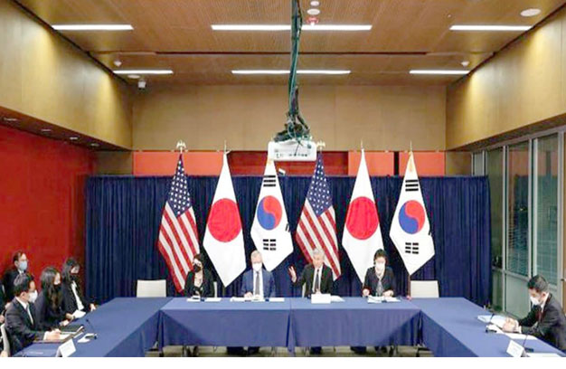 លោក Kim Sol Hwa មកពីវិទ្យាស្ថានក្រសួងការបរទេសកូរ៉ខាងជើងសម្រាប់ការសិក្សាប្រទេសជប៉ុនបាននិយាយថាប្រសិនបើជប៉ុនបន្តបង្កើតសម្ព័ន្ធភាពយោធាត្រីភាគីដឹកនាំដោយសហរដ្ឋអាមេរិក… … វានឹងនាំតំបន់អាស៊ីឦសានចូលទៅក្នុងអស្ថិរភាព ហើយទីបំផុតវាប្រែទៅជាសមុទ្រនៃអណ្តាតភ្លើង ដែលនឹងត្រូវវិនាស។
