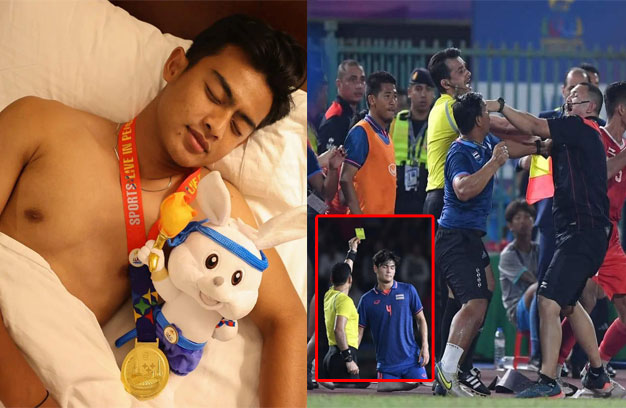 ភ្នំពេញ ៖ ការប្រកួតបាល់ទាត់ លើកចុងក្រោយ នៅវគ្គផ្តាច់ព្រ័ត្រ ក្នុងព្រឹត្តិការណ៍ស៊ីហ្គេម លើកទី៣២ ដែល កម្ពុជា ធ្វើជាម្ចាស់ផ្ទះ រវាងក្រុមឥណ្ឌូនេស៊ី និងថៃ នៅពហុកីឡដ្ឋានជាតិ អូឡាំពិក ចាត់ទុកជាការប្រកួតដ៏ ស្វិតស្វាញ និងក្តៅគគុក បង្កការភ្ញាក់ផ្អើលទាំងក្នុងតំបន់ និងពិភពលោក ព្រោះជាការប្រកួតដណ្តើមមេដាយ មាស ហើយក៏មានអំពើហិង្សាកើតឡើង នៅទីលានប្រកួត រវាងគូប្រកួតទាំងពីរក្រុម ក្នុងនោះមាន កីឡាករ បាល់ទាត់ជម្រើសជាតិថៃ ម្នាក់ បានបង្កហិង្សា និងបង្ហាញកាយវិការមិនសមរម្យ បន្ទាប់ពីក្រុមខ្លួនបានចាញ់ ការប្រកួត រហូតត្រូវអាជ្ញាកណ្តាលឲ្យកាតក្រហម បណ្តេញចេញពីទីលានប្រកួត ហើយចុងក្រោយ កីឡាករ ថៃរូបនេះ បានគប់ចោល នូវមេដាយប្រាក់ស៊ីហ្គេម និងតុក្កតាទៀតផង។