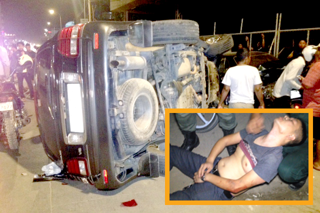ភ្នំពេញ ៖ បុរសជនជាតិចិនម្នាក់ស្រវឹងដេកលង់លក់នៅក្នុងរថយន្តរបស់ខ្លួន ទាំងបញ្ឆេះម៉ាស៊ីនរថយន្តត្រូវបានប្រជាពលរដ្ធនាំគ្នាដាស់អោយភ្ញាក់ដឹងខ្លួន ស្រាប់តែច្រឡំជាន់ហ្គែរេចង្កូតឡើងឃឿនបុករះម៉ូតូចតចោលនៅមុខហាងសាច់អាំង២គ្រឿង ប៉ះរថយន្ត១គ្រឿង និងបុកសន្តិសុខ រងរបួសធ្ងន់២នាក់ ទើបធ្វើឲ្យរថយន្តបង្កក្រឡាប់ ហេតុការណ៍នេះកើតឡើងនៅវេលាម៉ោង១០យប់ ថ្ងៃទី៨ ខែមករា ឆ្នាំ២០១៧ នៅតាមបណ្តោយផ្លូវ១០៨៦ មុខភោជយនីដ្ឋានឆៀល ស្ថិតក្នុងភូមិពោងពាយ សង្កាត់ភ្នំពេញថ្មី ខណ្ឌសែនសុខ ។