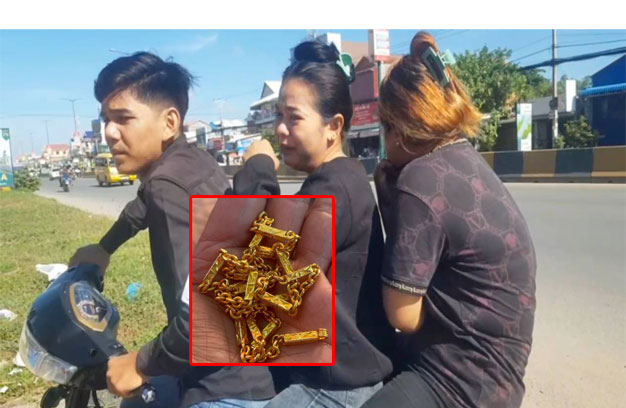 ភ្នំពេញ ៖ នារីវ័យក្មេងជាកម្មការិនីរោងចក្រ ២នាក់ បានដើរចេញពីបន្ទប់ជួល សំដៅទៅធ្វើការ ដល់ពាក់ កណ្តាលផ្លូវ លេចមុខស្ត្រីម្នាក់ បានដើរមកសួរថា មានរើសបានកញ្ចប់មាសទេ? លុះបន្តិចក្រោយមក មាន ស្ត្រីសង្ស័យម្នាក់ទៀត ដើរមកហៅ និងប្រាប់ថា ខ្លួនរើសបានមាស ១កញ្ចប់ រួចបបួលទៅរកកន្លែងស្ងាត់ ដើម្បីចែកគ្នា ធ្វើឱ្យនារីទាំង២នាក់ លង់ជឿ ព្រមទៅតាម និងត្រូវបានគេល្បួងដោះគ្រឿងលង្ការអស់ពីខ្លួន ជាថ្នូរនឹងកញ្ចប់មាស ដឹងអី ពេលជនសង្ស័យនាំគ្នាទៅបាត់អស់ បើកកញ្ចប់មាសមើល ទើបដឹងថាជាដែក ជ្រលក់ទឹកមាស ក៏រត់ទៅប្តឹងសមត្ថកិច្ចទាំងទឹកភ្នែក។