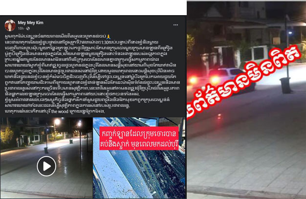 គួរបញ្ជាក់ថា កាលពីល្ងាចថ្ងៃទី១៦ ខែកក្កដា ឆ្នាំ២០២៣ ម្ចាស់គណនីហ្វេសប៊ុក ឈ្មោះ Mey Mey Kim បាន បង្ហោះវីដេអូឃ្លីប ចំនួន១ ព្រមទាំងបានរៀបរាប់ថា “សូមពុកម៉ែបងប្អូន ចំណាយពេលមើលវីដេអូនេះ រហូត ដល់ចប់ នេះជាហេតុការណ៍ដែលខ្ញុំជួបផ្ទាល់នៅថ្ងៃសុក្រ ទី៧ វេលា ម៉ោង១១និង៣០នាទីយប់ បន្ទាប់ពីនាង ខ្ញុំនិងម្តាយ ចេញពីហាង ហូបស៊ុបមួយកន្លែង ត្រឡប់ មកផ្ទះវិញ ស្រាប់តែមានក្រុមចោរមួយក្រុម មានឡាន ពីរគ្រឿង ម៉ូតូបីគ្រឿង និងមានអាវុធក្នុងដៃ ហើយមានឡានមួយគ្រឿងនោះ ទំនងជាឡានរបស់អង្គភាពក្នុង ក្របខ័ណ្ឌណាមួយ ដែលមានសារ៉ែននៅពីលើ ក្រុមចោរដែលមានគ្នាជាក្រុម ធ្វើសកម្មភាពយ៉ាង សាហាវ ឃោរឃៅ ស្ទាក់ខ្ញុំពីមាត់ផ្លូវចូលផ្ទះ រហូតដល់ក្នុងបុរី ដែលមានសន្តិសុខនៅយាមពីមុខ តែឃាត់វាមិនបាន រហូតចូលក្នុងបុរី ដែលមានផ្ទះប្រជាជនរស់នៅជុំវិញ ដោយមូលហេតុពេលនោះ សន្តិសុខបុរី មិនអាចឃាត់ និងជួយដល់ខ្ញុំ ខ្ញុំក៏បានសម្រេចចិត្តជិះចេញពីបុរី ដើម្បីទៅផ្ទះបងប្អូន នៅម្តុំបឹងត្របែក ឱ្យជួយ តែពួកវានៅតែ ព្យាយាមជិះតាមពីក្រោយ រហូតនាងខ្ញុំជាន់ឡានសឹងតែឆេះម៉ាស៊ីន ទម្រាំដល់ផ្ទះបងប្អូន និងមានប្រជាពលរដ្ឋ រស់នៅកុះករច្រើន ទើបមានសុវត្ថិភាព។ នេះជាវីដេអូនៅតាមដងផ្លូវជុំវិញបុរី រាល់វីដេអូ រូបភាព និងផ្លាកលេខ ឡានក្រុមចោរ ដែលធ្វើសកម្មភាពនៅយប់នោះ ខ្ញុំថតបានទាំងអស់។ ខ្ញុំសូមអំពាវនាវដល់សមត្ថកិច្ច និងថ្នាក់ ដឹកនាំ សូមជួយពង្រឹង និងវែកមុខរកពួកក្រុមចោរប្លន់ដ៏សាហាវឃោរឃៅទាំងនេះផង ដើម្បីសុវត្ថិភាពក្នុងការ រស់នៅរបស់ប្រជាពលរដ្ឋ ខណៈហេតុការណ៍នេះ កើតនៅបុរី The wood ក្រោយផ្សារព្រែកឯង…”។