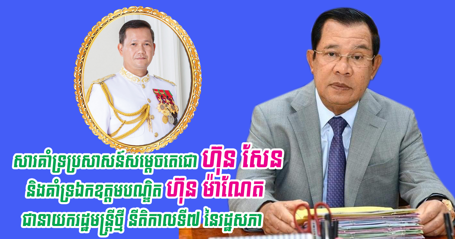 យើងខ្ញុំសូមប្រកាសគាំទ្រទាំងស្រុងចំពោះការសម្រេចចិត្តដ៏ត្រឹមត្រូវរបស់សម្តេចតេជោ ហ៊ុន សែន និងសូមប្រកាសគាំទ្រទាំងស្រុងចំពោះឯកឧត្តមបណ្ឌិត ហ៊ុន ម៉ាណែត សម្រាប់កាន់តួនាទីជានាយករដ្ឋមន្រ្តីថ្មី សម្រាប់អាណត្តិទី៧នេះ ដើម្បីបន្តដឹកនាំប្រទេសកម្ពុជា ពង្រឹងសុខសន្តិភាពកាន់តែរឹងមាំ, ប្រទេសជាតិកាន់តែមានការអភិវឌ្ឍរីកចំរើន និងមានមោទនភាព ហើយប្រជាជនកាន់តែមានជីវភាពធូរធារ និងរស់នៅប្រកបដោយសេចក្តីសុខសាន្តបន្តទៀត។