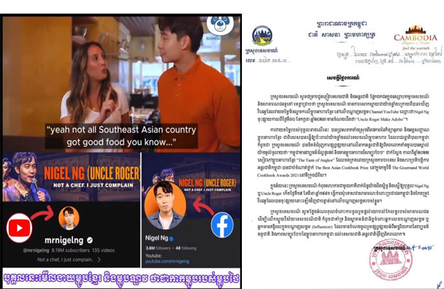 ភ្នំពេញ ៖ ក្រសួងទេសចរណ៍កម្ពុជា នៅថ្ងៃទី៧ ខែសីហា ឆ្នាំ២០២៣ បានចេញសេចក្តីថ្លែងការណ៍ ប្រតិកម្មចំពោះ បុគ្គលឈ្មោះ Nigel Ng (Uncle Roger) ដែលបានអធិប្បាយលើបណ្តញសង្គមរបស់ខ្លួន វាយតម្លៃមិនល្អមកលើ ម្ហូបអាហារខ្មែរ ដែលធ្វើឱ្យប៉ះពាល់យ៉ាងខ្លាំងដល់ទេសចរណ៍ម្ហូបអាហារខ្មែរ និងបានតម្រូវឱ្យបុគ្គលរូបនេះធ្វើ ការសុំទោសជាសាធារណៈចំពោះប្រជាជនកម្ពុជា។
