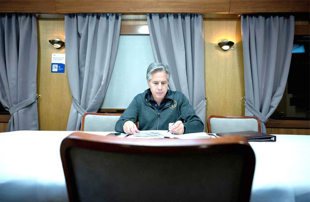 រដ្ឋមន្ត្រីការបរទេសអាមេរិកលោក Anthony Blinken បានមកដល់ទីក្រុងគៀវក្នុងដំណើរបំពេញទស្សនកិច្ចដោយ មិនប្រកាសឲ្យដឹងមុនកាលពីថ្ងៃពុធ ប៉ុន្មានម៉ោងបន្ទាប់ពីប្រទេសរុស្ស៊ីបានបើកការវាយប្រហារដោយមីស៊ីល លើកដំបូងរបស់ខ្លួនក្នុងរយៈពេលមួយសប្តាហ៍ប្រឆាំងនឹងរដ្ឋធានីអ៊ុយក្រែន។នេះជាដំណើរទស្សនកិច្ចលើកទីបីរបស់លោកទៅកាន់រដ្ឋធានីអ៊ុយក្រែនចាប់តាំងពីការចាប់ផ្តើមនៃការឈ្លានពានពេញលេញរបស់រុស្ស៊ីនៅក្នុងខែកុម្ភៈឆ្នាំមុន។