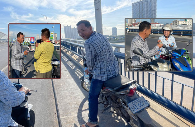 ភ្នំពេញ ៖ បុរសម្នាក់ នៅសុខៗជិះម៉ូតូ ១គ្រឿង មកផ្តួលចោលនៅលើស្ពានជ្រោយចង្វា រួចស្ទុះឡើងតោងបង្កាន់ ដៃស្ពាន ធ្វើជាប៉ុនប៉ងលោតទឹកសម្លាប់ខ្លួន ដើម្បីទាក់ទាញចំណាប់អារម្មណ៍អ្នកសារព័ត៌មាន និង សមត្ថកិច្ច ជួយដឹងឮ និងជួយរកយុត្តិធម៌ឱ្យខ្លួន ដោយអះអាងថា ត្រូវម្ចាស់កសិដ្ឋានចិញ្ចឹមទា មួយកន្លែងនៅខេត្តកំពង់ស្ពឺ ឆបោក លុះខ្លួនយកម៉ូតូជិះចេញពីកសិដ្ឋាន បែរជាត្រូវគេប្តឹងចោទប្រកាន់ថា រត់ចោលកន្លែង និងលួចម៉ូតូទៅវិញ។