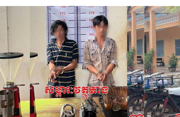 ខេត្តសៀមរាប ៖ ជនសង្ស័យ ចំនួន២នាក់ បានធ្វើសកម្មភាពលួចគាស់តូបកាហ្វេ មួយកន្លែង និងបានលួចយក ម៉ាស៊ីនឆុងកាហ្វេ ១គ្រឿង បានសម្រេច តែពេលកំពុងជិះគេចខ្លួន បែរជាជួបនឹងកម្លាំងសមត្ថកិច្ចល្បាត ឃាត់ខ្លួន នាំយកទៅចាត់ការតាមច្បាប់។