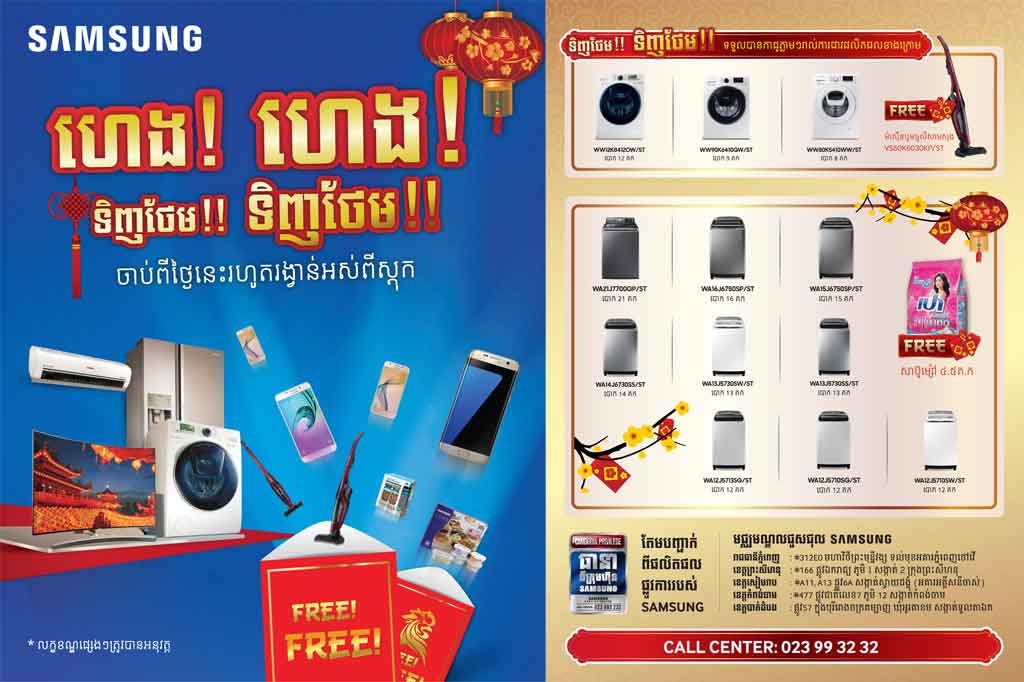 ដើម្បីអបអរសាទរក្នុងឱកាសពិធីបុណ្យចូលឆ្នាំថ្មីប្រពៃណីជនជាតិចិននាពេលខាងមុខនេះ ក្រុមហ៊ុនសាមសុងផ្តល់ជូននូវកម្មវិធីដ៏ពិសេសគឺ ហេង ហេង“ទិញថែម! ទិញថែម!”សំរាប់អតិថិជនទាំងអស់ដែលតែងតែនិយមគាំទ្រនិងជាវផលិតផលអេឡិកត្រូនិកពីក្រុមហ៊ុនសាមសុង។