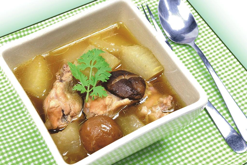 -ដាំទឹកស៊ុបឱ្យពុះ ដាក់ជីរវ៉ាន់ស៊ុយ ខ្ទឹមស និងម្រេច រង់ចាំឱ្យពុះម្តងទៀត សឹមថែមភ្លៅមាន់ និងផ្សិតចិន។ ពេល ពុះម្តងទៀត ដួសពពុះចេញ ហើយស្ងោរបន្តរហូតដល់សាច់ មាន់ឆ្អិន សឹមថែមត្រឡាច។