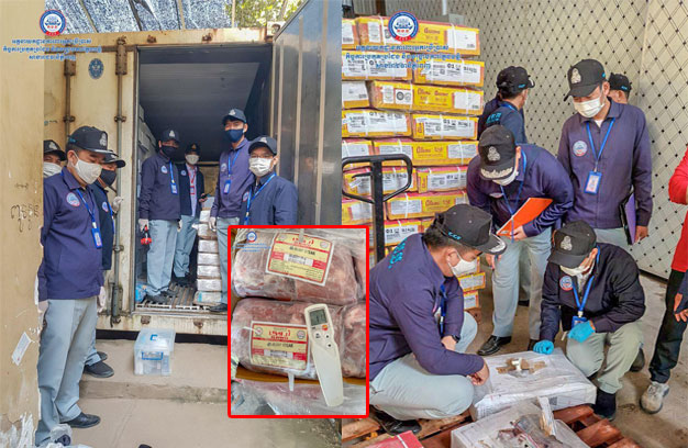 ភ្នំពេញ ៖ មន្ត្រីជំនាញអគ្គនាយកដ្ឋាន ក.ប.ប បានបន្តត្រួតពិនិត្យទីតាំងស្តុកទុកសាច់បង្កកចំនួន២កន្លែង ស្ថិតនៅក្នុងខណ្ឌឫស្សីកែវ រាជធានីភ្នំពេញ កាលពីថ្ងៃទី២១ ខែវិច្ឆិកា ឆ្នាំ២០២៣ ជាលទ្ធផល បានរកឃើញ សាច់មាន់ គោ ក្របី និងគ្រឿងក្នុងបង្កកខូចគុណភាព សរុប ប្រមាណជាង១២តោន។