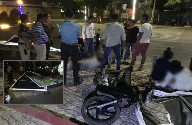 ភ្នំពេញ ៖ យុវវ័យប្រុសស្រី ៣នាក់ ជិះម៉ូតូ ១គ្រឿង ដឹកគ្នា ក្នុងល្បឿនយ៉ាងលឿន លុះមកដល់ត្រង់ចំណុចរង្វង់មូល មិនបង្អង់ល្បឿន ក៏ជ្រុលឡើងខឿនផ្លូវ រួចជ្រុលទៅបុកបង្គោលប៉ាណូ បណ្តាលឱ្យបាក់អស់ ១ផ្ទាំង ធ្វើឱ្យយុវជន ២នាក់ រងរបួសធ្ងន់ ចំណែកយុវតីម្នាក់ទៀត រងរបួសស្រាល។