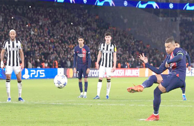 ខ្សែប្រយុទ្ធ Kylian Mbappe ស៊ុតបាល់ប៉េណាល់ទីក្នុងម៉ោងបន្ថែម៩០បូក៨បដិសេធជ័យជម្នះរបស់ក្លឹប Newcastle ធ្វើឲ្យលទ្ធផលបានត្រឹមតែស្មើ១-១ស្ថិតក្នុងភាពប្រទាញប្រទង់គ្នារកកៅអីមួយឡើងទៅវគ្គ១៦ក្រុម ។