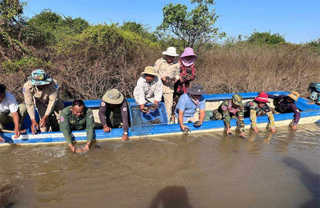 ខេត្តពោធិ៍សាត់ ៖ កូនអណ្តើកស្រែ អណ្តើកបិទមុខ ឬអណ្តើកក្បាលធំ សរុបចំនួន ៥៥ក្បាល ដែលត្រូវបាន លោកខូយ រីដា អភិបាល ខេត្តពោធិ៍សាត់ ប្រគល់ជូនសហគមន៍នេសាទស្រីចឹក បានធ្វើពិធីលែងក្នុងតំបន់អភិ រក្សត្រីមេពូជ ព្រែកតាចាន់ ក្នុងភូមិសាស្ត្រព្រៃរនាម បឹងទន្លេ សាប ស្ថិតក្នុងភូមិតាម៉ៅ ឃុំកញ្ជរ ស្រុកកណ្តៀង ដើម្បីចូលរួមថែរក្សាការពារធនធានជលផលឱ្យនៅគង់វង្ស និងបង្កើនរីកសាយឱ្យកាន់តែច្រើនឡើងថែមទៀត ទៅថ្ងៃអនាគត។