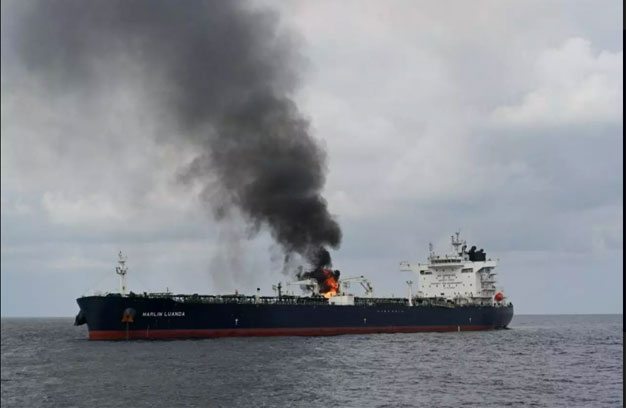 នៅថ្ងៃដដែល ក្រុមប្រតិបត្តិការដែនសមុទ្រ របស់កងកម្លាំងប្រដាប់អាវុធរបស់ចក្រភពអង់គ្លេស បានទទួលរបាយការណ៍ថា នាវាដឹកប្រេងរបស់អង់គ្លេស Marlin Luanda ត្រូវបានវាយប្រហារដោយកាំជ្រួចផ្លោង ខណៈកំពុងបើកនៅឈូងសមុទ្រអេដេន(Aden) រហូតដល់ត្រូវភ្លើងឆេះ នៅថ្ងៃទី២៦ ខែមករា ឆ្នាំ២០២៤ ។