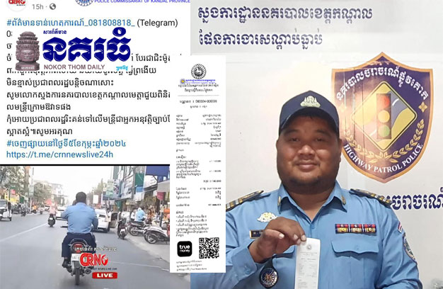 ភ្នំពេញ ៖ ក្រុមការងារព័ត៌មាននិងប្រតិកម្មរហ័ស នៃស្នងការដ្ឋាននគរបាលខេត្តកណ្តាល បានឆ្លើយតបចំពោះការផ្សព្វផ្សាយព័ត៌មាន និងវីដេអូ បង្ហាញពីមន្ត្រីនគរបាលស្លៀកពាក់ឯកសណ្ឋាន ជិះម៉ូតូមិនពាក់មួក និងនិយាយទូរស័ព្ទ ពេលកំពុងបើកបរ ដោយភ្ជាប់ជាមួយខ្លឹមសារថា “ចាប់ពលរដ្ឋឱ្យគោរពច្បាប់ចរាចរណ៍ ចំណែកខ្លួនឯងជាមន្ត្រីអនុវត្តច្បាប់ចរាចរណ៍ បែរជាជិះម៉ូតូអត់ពាក់ម៉ួកសុវត្ថិភាពហើយ និយាយទូរស័ព្ទធ្វើព្រងើយ មិនខ្មាសប្រជាពលរដ្ឋបន្តិចណាសោះ សូមលោកស្នងការនគរបាលខេត្តកណ្តាល មេត្តាជួយពិនិត្យមើលមន្ត្រីក្រោមឱវាទផង កុំឱ្យប្រជាពលរដ្ឋរិះគន់ទៅលើមន្ត្រី ជាអ្នកអនុវត្តច្បាប់ដែលស្អាតស្អំ”។