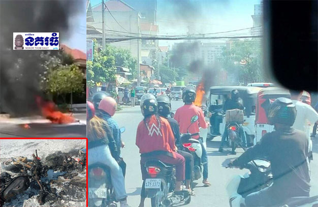 ភ្នំពេញ ៖ ប្តីប្រពន្ធ ២នាក់ ជិះម៉ូតូដឹកគ្នា ទើបនឹងត្រឡប់មកពីស្រុកកំណើត បានទាក់ចង្កូតជាមួយម៉ូតូកង់បី ១គ្រឿង បណ្តាលឱ្យដួលអូសកកិតនឹងថ្នល់ ធ្វើឱ្យបែកផ្កាភ្លើង ឆាបឆេះយ៉ាងសន្ធោសន្ធៅ បណ្តាលឱ្យម៉ូតូខាងលើ រងការខូចខាតអស់គ្មានសល់ ចំណែកប្តីប្រពន្ធ ជាម្ចាស់ម៉ូតូ គ្រាន់តែរងរបួសរលាត់ដៃជើងប៉ុណ្ណោះ។ហេតុការណ៍គ្រោះថ្នាក់ចរាចរណ៍ បង្កជាការឆាបឆេះម៉ូតូ ១គ្រឿងនេះ បានកើតឡើងកាលពីវេលាម៉ោង ១០និង២០នាទី ព្រឹក ថ្ងៃទី១៧ ខែកុម្ភៈ ឆ្នាំ២០២៤ នៅតាមផ្លូវបេតុង មុខវត្តសំរោងអណ្តែត ក្នុងភូមិក្រុងខ្មែរ សង្កាត់គោកឃ្លាង ខណ្ឌសែនសុខ។