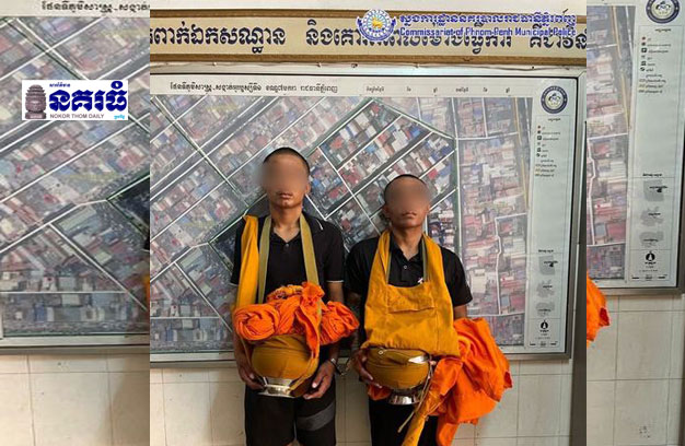 ភ្នំពេញ ៖ ជនសង្ស័យ ចំនួន២នាក់ បានក្លែងបន្លំខ្លួនជាព្រះសង្ឃ ដោយកោរសក់ ស្លៀកស្បង់ ចីវរ ដើរបិណ្ឌ បាត្រនៅក្នុងផ្សារអូរឫស្សី ដើម្បីយកលុយទៅទិញថ្នាំញៀនជក់ លុះប្រជាពលរដ្ឋសង្ស័យ រាយការណ៍ប្រាប់សមត្ថកិច្ច ចុះឃាត់សាកសួរ ដឹងថាជាសង្ឃក្លែងក្លាយ ក៏ចាប់ឃាត់ ខ្លួនទាំង២នាក់ នាំយកទៅចាត់ការតាម ច្បាប់។
