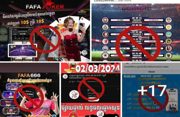 ភ្នំពេញ ៖ អគ្គលេខាធិការដ្ឋាន នៃគណៈកម្មការគ្រប់គ្រងល្បែងពាណិជ្ជកម្មកម្ពុជា (គ.ល.ក) បានពិនិត្យឃើញមានការផ្សព្វផ្សាយពាណិជ្ជកម្ម អំពីល្បែងកាស៊ីណូអនឡាញ ល្បែងភ្នាល់អនឡាញ និងឆ្នោតកន្ទុយលេខ ដែលជាល្បែងស៊ីសងខុសច្បាប់តាម Facebook ប្រព័ន្ធតេលេក្រាម និងបណ្តាញសង្គម យូធូប (Youtube) ចំនួន២១ទំព័រ ដែលជាសកម្មភាពល្មើសនឹងច្បាប់ស្តីពីការគ្រប់គ្រងល្បែងពាណិជ្ជកម្ម និងច្បាប់ស្តីពីការបង្ក្រាបល្បែងស៊ីសង។