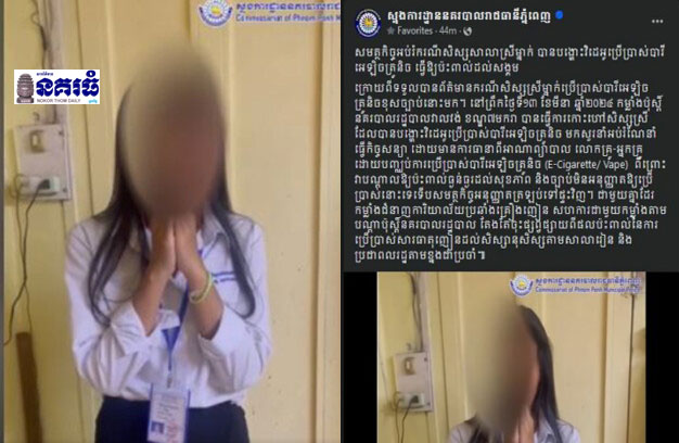 ភ្នំពេញ ៖ យុវតីជាសិស្សសាលាម្នាក់ បានជក់បារីអេឡិចត្រូនិក (E-Cigarette/Vape) ថតវីដេអូបង្ហោះបង្អួតផ្អើលពេញបណ្តាញសង្គម ទីបំផុតត្រូវសមត្ថកិច្ចកោះហៅយកមកអប់រំណែនាំឱ្យបញ្ឈប់ការប្រើប្រាស់បារីអេឡិចត្រូនិកខុសច្បាប់ ដែលធ្វើឱ្យប៉ះពាល់សុខភាពផ្ទាល់ខ្លួន និងដល់សង្គមជាតិទាំងមូល។