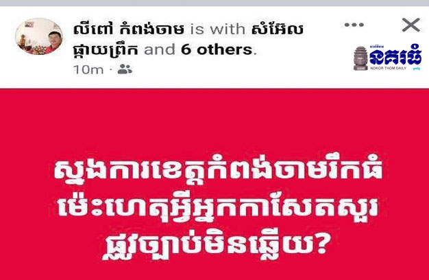 គួរបញ្ជាក់ថា កាលពីយប់ថ្ងៃទី២៧ ខែមីនា ឆ្នាំ២០២៤ មានគណនីហ្វេសប៊ុកមួយ ឈ្មោះ «លីពៅ កំពង់ចាម» បានបង្ហោះខ្លឹមសារថា “ស្នងការខេត្តកំពង់ចាម ឫកធំម៉្លេះ ហេតុអ្វីអ្នកកាសែតសួរផ្លូវច្បាប់ មិនឆ្លើយ?”។