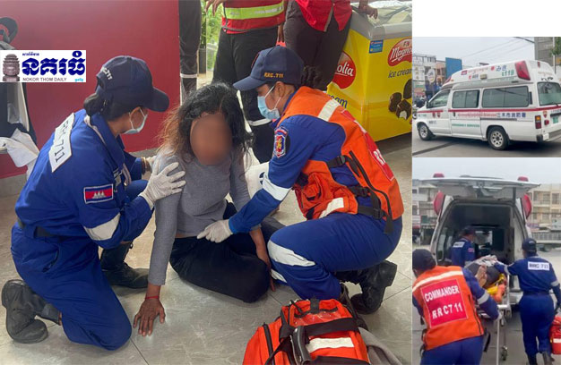 ភ្នំពេញ ៖ ស្ត្រីម្នាក់ បានចូលមកសម្រាកថ្ងៃត្រង់ នៅក្នុងម៉ាតស្ថានីយប្រេង មួយកន្លែង ស្រាប់តែវិលមុខ ដួល សន្លប់ បង្កឱ្យមានការភ្ញាក់ផ្អើលដល់បុគ្គលិកម៉ាត ជួយសង្គ្រោះ និងទាក់ទងសុំអន្តរាគមន៍ពីក្រុមសង្គ្រោះអង្គ ភាព៧១១ ជួយដឹកបញ្ជូនទៅកាន់មន្ទីរពេទ្យភ្លាមៗ។