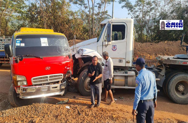 ខេត្តកំពង់ស្ពឺ ៖ រថយន្តសណ្តោងកុងតឺន័រ ១គ្រឿង បើកចុះចំណោតលោកយាយម៉ៅ ពេជ្រនិល ដាច់ហ្វ្រាំង បណ្តាលឱ្យជ្រុលទៅបុករថយន្តដឹកប្រេង ១គ្រឿង ដែលកំពុងបើកបរបញ្ច្រាសទិសគ្នា បណ្តាលឱ្យរងការខូចខាតយ៉ាងដំណំទាំងសងខាង។