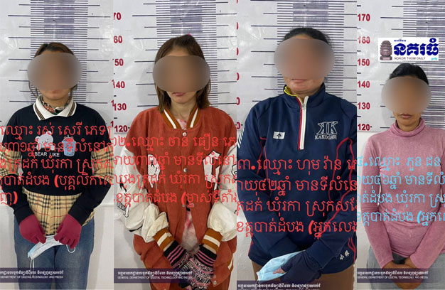 ខេត្តបាត់ដំបង ៖ កម្លាំងជំនាញផ្នែកព្រហ្មទណ្ឌ នៃអធិការដ្ឋាននគរបាលស្រុកសង្កែ បានចុះបង្ក្រាបករណីលេងល្បែងស៊ីសងដោយខុសច្បាប់ (ល្បែងអនឡាញ) ១កន្លែង ដោយឃាត់ខ្លួនជនសង្ស័យទាំងម្ចាស់ទីតាំង បុគ្គលិកល្បែងអនឡាញ និងអ្នកលេង សុទ្ធតែជាមនុស្សស្រី សរុបចំនួន៤នាក់។