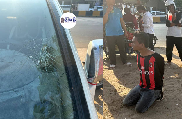 ភ្នំពេញ ៖ នារីម្នាក់ បានបើករថយន្តមកអែបឈប់ចិញ្ចើមផ្លូវ ដើម្បីនិយាយទូរស័ព្ទ ស្រាប់តែលេចមុខបុរសម្នាក់ ដើរមកសុំលុយ ១ម៉ឺនរៀល តែនាងមិនឱ្យ ទើបធ្វើឱ្យបុរសនោះខឹង ក៏ដាល់កញ្ចក់រថយន្ត ១ដៃ បែកកញ្ចក់ខ្ទេច ទីបំផុតត្រូវសមត្ថកិច្ចចាប់វាយខ្នោះ នាំយកទៅចាត់ការតាមច្បាប់។