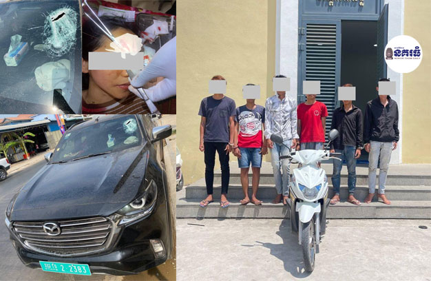 ភ្នំពេញ ៖ ក្មេងទំនើងឈាមរាវ ១ក្រុម បានធ្វើសកម្មភាពប្រើដុំថ្ម គប់ទៅលើរថយន្ត ២គ្រឿង បណ្តាលឱ្យបែកកញ្ចក់ ក្នុងនោះរថយន្ត ១គ្រឿង បានបែកកញ្ចក់និងធ្លុះដុំថ្មចូលដល់ក្នុងរថយន្ត ត្រូវស្ត្រីជាម្ចាស់រថយន្ត របួសបែកថ្ងាស ដេរចំនួន៣០ថ្នេរ។ ចំណែកក្រុមក្មេងទំនើង បាននាំគ្នាគេចខ្លួនបាត់អស់។ លុះ៧ថ្ងៃក្រោយមក ត្រូវសមត្ថកិច្ចជំនាញស្រាវជ្រាវបង្ក្រាបបានជាបន្តបន្ទាប់ សរុបចំនួន៦នាក់ នាំយកមកចាត់ការតាមច្បាប់។