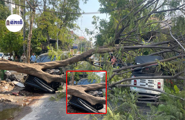 ភ្នំពេញ ៖ ដើមក្ងោក ១ដើម នៅសុខៗបានរលំសង្កត់ម៉ូតូកង់បី និងរថយន្ត បណ្តាលឲ្យខូចខាត តែមិនបង្កឲ្យមនុស្សរងរបួសទេ ។