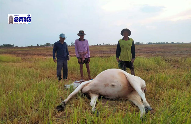 ខេត្តបន្ទាយមានជ័យ ៖ សត្វគោ ចំនួន៣ក្បាល ដែលត្រូវបានប្រជាពលរដ្ឋយកទៅចងឱ្យស៊ីស្មៅនៅកណ្តាលវាលស្រែ ត្រូវបានរន្ទះបាញ់ បណ្តាលឱ្យងាប់រដូករណែលពេញវាលស្រែ ក្រោយមានភ្លៀងធ្លាក់១មេ លាយឡំដោយផ្គររន្ទះ។