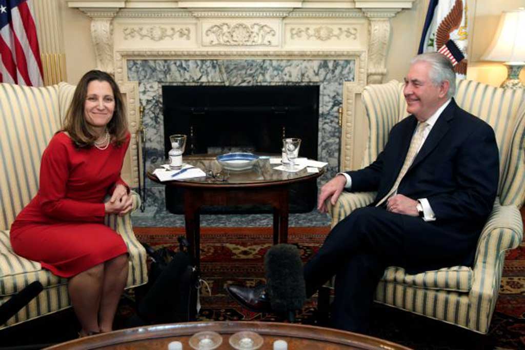 នៅក្នុងជំនួបរវាងលោក Tillerson និងលោកស្រី Freeland ក៏ដូចជាកិច្ចពិភាក្សាដាច់ដោយឡែកមួយជាមួយនិងរដ្ឋមន្ត្រីការបរទេសម៉ិកស៊ិកលោក Luis Videgaray នៅក្រសួងការបរទេសដែលពាក់ព័ន្ធនិងកិច្ចព្រមព្រៀងពាណិជ្ជកម្មសេរីអាមេរិក(NAFTA)ក្របខ័ណ្ឌត្រីភាគី លោកប្រធានាធិបតី ដូណាល់ ត្រាំ ចង់ឲ្យមានការចរចាឡើងវិញ ។