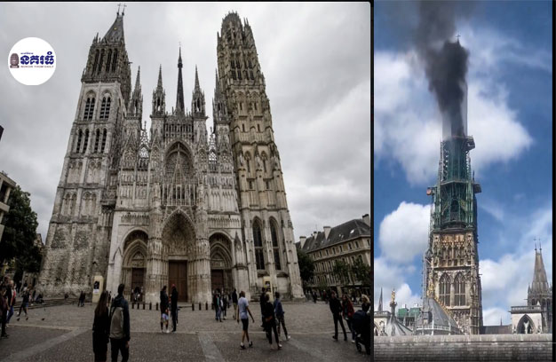 ប្រទេសបារាំង ៖ អគ្គិភ័យបានឆាបឆេះវិហារ Cathédrale Notre-Dame de Rouen ដែលជាវិហាររ៉ូម៉ាំងកាតូលិកបុរាណ នៅទីក្រុង Rouen ខេត្តអិចក្លេស្យង់ទិក ន័រម៉ង់ឌី (ecclésiastique de Normandie) នៅភាគ ពាយ័ព្យនៃប្រទេសបារាំង នៅថ្ងៃទី១១ ខែកក្កដា ឆ្នាំ២០២៤។