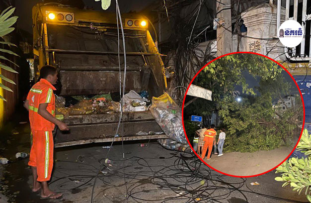 ភ្នំពេញ ៖ រថយន្តប្រមូលសំរាម របស់ក្រុមហ៊ុនស៊ីនទ្រី ១គ្រឿង បើកបរបម្រុងបត់ចូលផ្លូវលំ ដើម្បីប្រមូលសំរាម លុះដល់មុខហាង «ជួបឃ្លាន» ទំនងជាឃ្លាន ចង់ចូលហាង ក៏បានទាក់ខ្សែភ្លើង បណ្តាលឱ្យបាក់បង្គោលភ្លើង រលំដើមជ្រៃក្រឹម និងស្លាកហាង។