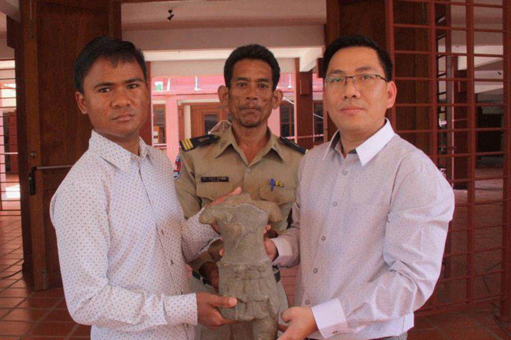 ខេត្តសៀមរាប ៖ ប្រជាពលរដ្ឋម្នាក់ រើសបានព្រះបដិមាបុរាណបាក់បែក១ព្រះអង្គ បាន យកមកប្រគល់ជូនអាជ្ញាធរអប្សរា ដើម្បីរក្សា ទុកនៅសារមន្ទីរព្រះនរោត្តម សីហនុ–អង្គរ ក្រុងសៀមរាប កាលពីថ្ងៃទី១០ ខែកុម្ភៈ ឆ្នាំ ២០១៧។