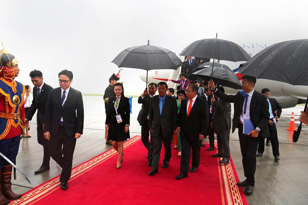 ភ្នំពេញ ៖ កាលពីព្រឹកថ្ងៃទី14 ខែកក្កដា ឆ្នាំ2016 សម្តេចនាយករដ្ឋមន្ត្រីហ៊ុន សែន ប្រមុខរាជរដ្ឋាភិបាលកម្ពុជា និងភរិយា បាន ដឹកនាំគណះប្រតិភូជាន់ខ្ពស់ អញ្ជើញទៅចូល រួមកិច្ចប្រជុំកំពូលអាស៊ី-អឺរ៉ុប លើកទី11 នៅ ទីក្រុងអ៊ូឡង់បាទ័រ ប្រទេសម៉ុងហ្គោលី តបតាម ការគោរពអញ្ជើញរបស់លោកត្សាឃីអាហ្គីន អែលប៊េឌូរ្ស (Tsakhiagiin Elbegdorj) ប្រធានាធិបតីម៉ុងហ្គោលី។