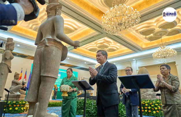 ភ្នំពេញ ៖ នៅព្រឹកថ្ងៃទី២២ ខែសីហា ឆ្នាំ២០២៤ សម្តេចហ៊ុន ម៉ាណែត នាយករដ្ឋមន្ត្រី នៃព្រះរាជាណាចក្រកម្ពុជា អញ្ជើញជាអធិបតី ទទួលវត្ថុបុរាណខ្មែរ ដែលបានប្រគល់ជូនព្រះរាជាណាចក្រកម្ពុជាវិញ នៅវិមានសន្តិភាព រាជធានីភ្នំពេញ ដែលជាកេរដំណែលដូនតា បន្ទាប់ពីបានរសាត់ចាកឆ្ងាយពីមាតុភូមិកំណើត អស់រយៈពេលជាច្រើនឆ្នាំ ដែលបង្កឡើងដោយសង្គ្រាម អំពើចោរកម្ម និងការជួញដូរខុសច្បាប់ទៅក្រៅប្រទេស។